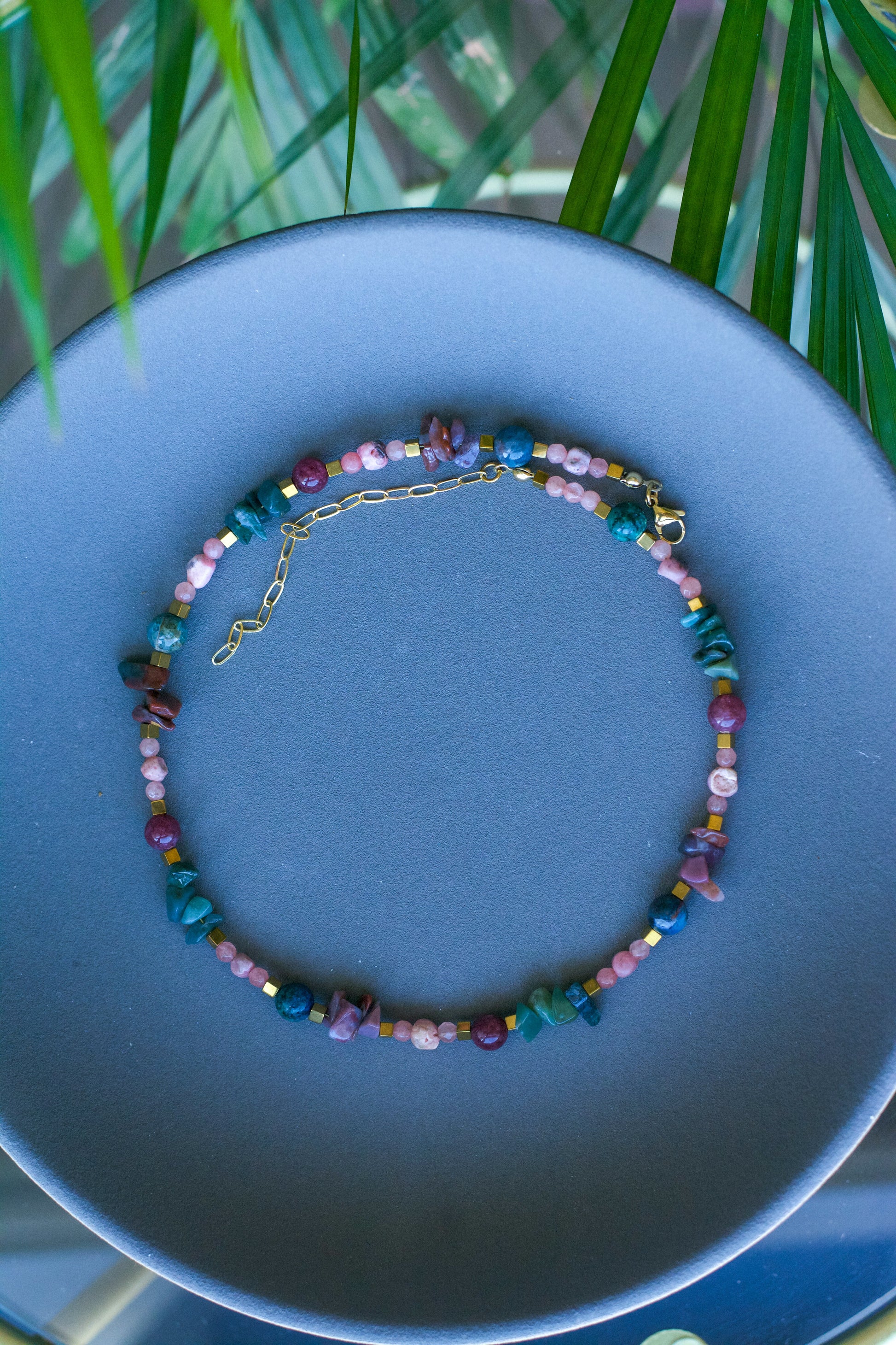 Doğal taşlar ve altın kaplama parçalar içeren koleksiyonlarımızın uzun ömürlü olması için, parfüm, krem ve alkol gibi kimyasallarla temasından kaçınılmasını öneririz. Bu tür maddeler, taşların doğal yapısını ve kaplamaların dayanıklılığını olumsuz etkileyebilir. Ürünlerinizi korumak için bu tür dış etkenlerden uzak tutmanız önemlidir.